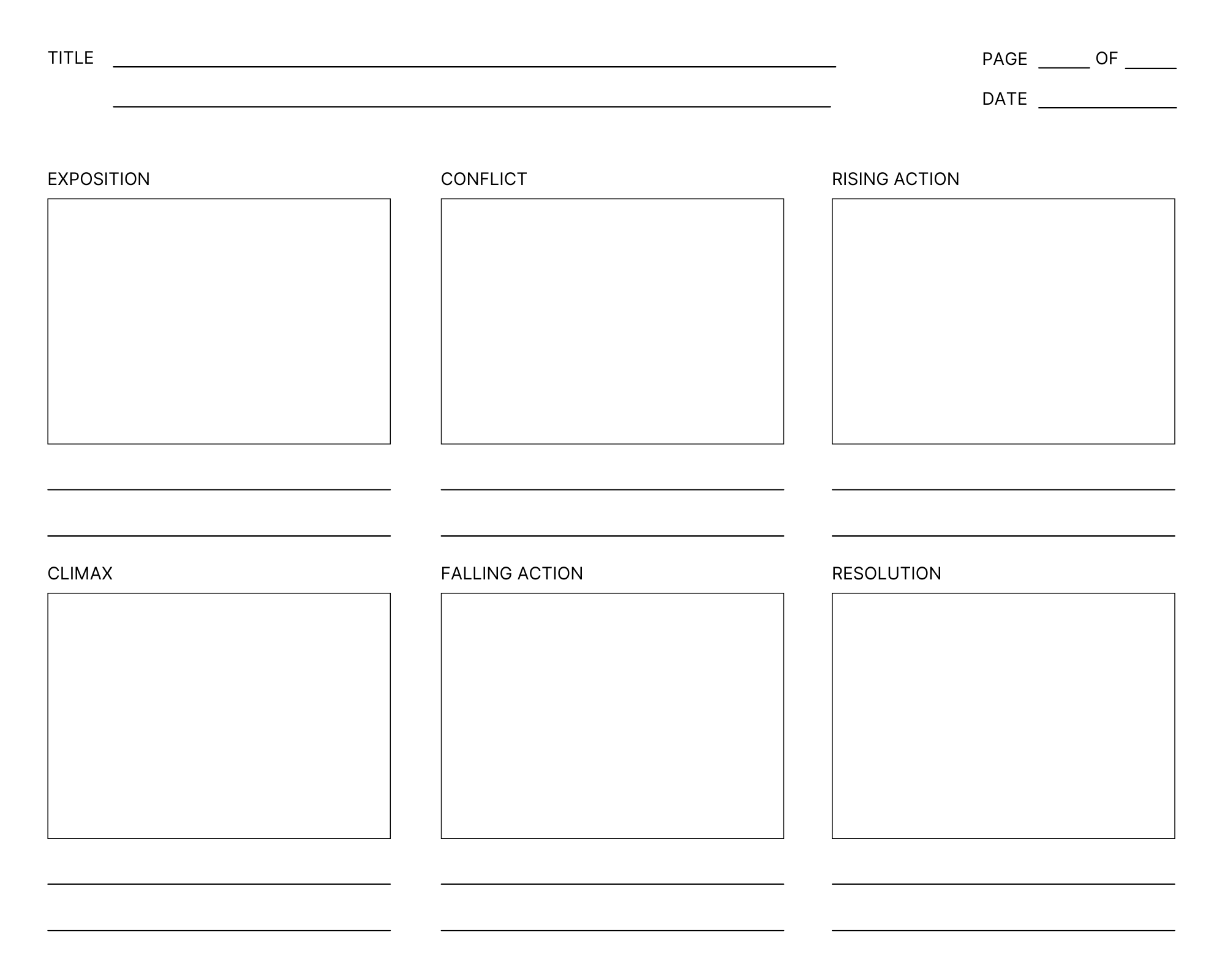 • Storyboard – Standard storyboard layout in four parts (rows) with 5 columns for chapters or scenes which can be added as needed. The end of each row is the turning point. Adjust boxes as needed to fit your story.